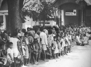 Het Rode Kruis deelt voedsel uit in Blitar, ná de Japanse bezetting. Staat de vierling misschien op deze foto?