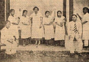 Links op de voorgrond moeder B. Karmo, In het midden zr. Guljee en vier verpleegsters die ieder een kind dragen. Rechts met das de directeur van het ziekenhuis, dr. R. Soemantri.