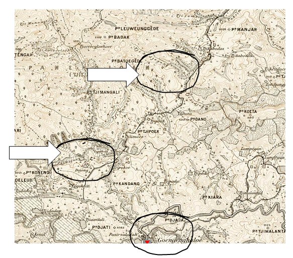 Locaties Goenoeng Haloe (onder), Tjitjalobak (links) en Montaja (boven)