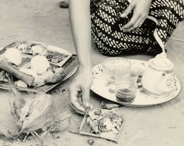 Bij een bezoek in 1997 aan het kratonmuseum in Yogyakarta zag ik in een flits in een hoek een offer liggen, rijst op een pisangblad. Het meisje dat als gids ons vergezelde was zichtbaar verlegen, maar het kwam er toch uit: de vloer werd daar omhoog gedrukt door een boomwortel die moest worden afgekapt, zodoende!