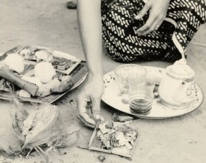 Baboe Soep bracht af en toe een offer onder de blimbingboom, een pisangblad met wat gekookte rijst. Daar zat een oude man. Ik zag wel niemand, maar ja, baboe Soep had het gezegd! Na een half uur haalde ze het weer weg, maar ik zag dat er niet van was gegeten. Kort antwoord: ´Hij heeft genoeg gehad´. En natuurlijk, de kippen moesten ook wat eten. Dat was mijn eerste kennismaking met de huisgeest, de jaga rumah.