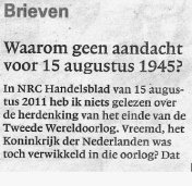 In NRC Handelsblad van 15 augustus 2011 heb ik niets gelezen over de herdenking van de Tweede Wereldoorlog. Vreemd, het Koninkrijk der Nederlanden was toch verwikkeld in die oorlog? Dat 15 augustus 1945 voor de Nederlanders (en alle Nederlandse onderdanen) in Indië geen bevrijding was, maar het begin van nieuwe ellende, schijnt men in Nederland niet te weten, anders had NRC Handelsblad daar toch wel aandacht aan besteed. Er was geen euforie, er was geen polonaise, er is geen aandacht. Jammer! Of staat in het Stijlboek: 5 mei wel, en 15 augustus niet?´