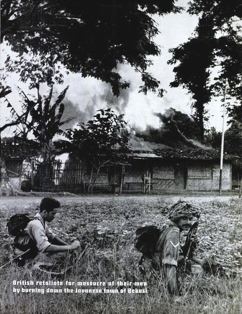 ´BATAVIA, Friday.-Bekasi, a small village about eight miles from Batavia, has been completely destroyed by British forces following the massacre of British and Indian survivors from a RAF Dakota which crashed near Batavia recently. RAF Thunderbolts and Mosquitoes led the assault on the village and when the last shot was fired, Bekasi looked like ´a picture of an atom bomb explosion´, according to correspondents.