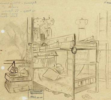 Mijn moeder rapporteert in haar verslag in het beduimelde schoolschriftje: ’Eerst lagen we op de grond. Later kregen we stapelbedden van hout. Die probeerde je dan met dekentjes en gordijntjes van handdoek tot een kamertje te maken.’