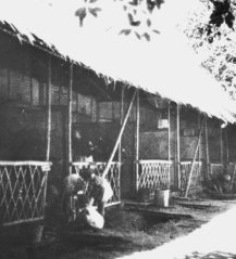 Mijn moeder: ‘Daar sliepen we in stapelbedden vlak naast elkaar. Wel met z’n vijftigen of zestigen. Er was verder niets, geen water (moesten we in de gevangenis halen, als ook het eten), en geen W.C.. Er werd een smalle diepe geul in de grond buiten de loods gegraven. Er overheen kwamen bamboe en bilik tussenschotjes. En dat was het! Je begrijpt hoe veel vliegen dit aantrok. En hoeveel mensen er ziek werden!’