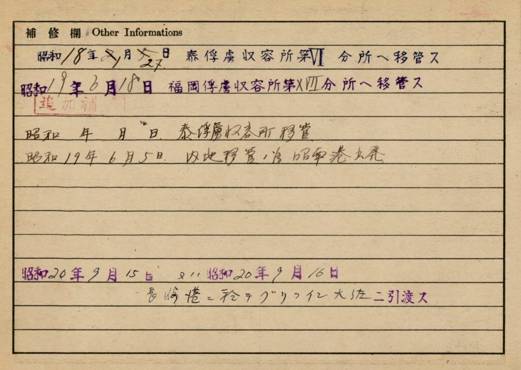 Transferred to No.1 Branch Camp of Fukuoka POW Camp on 4 December 1943;