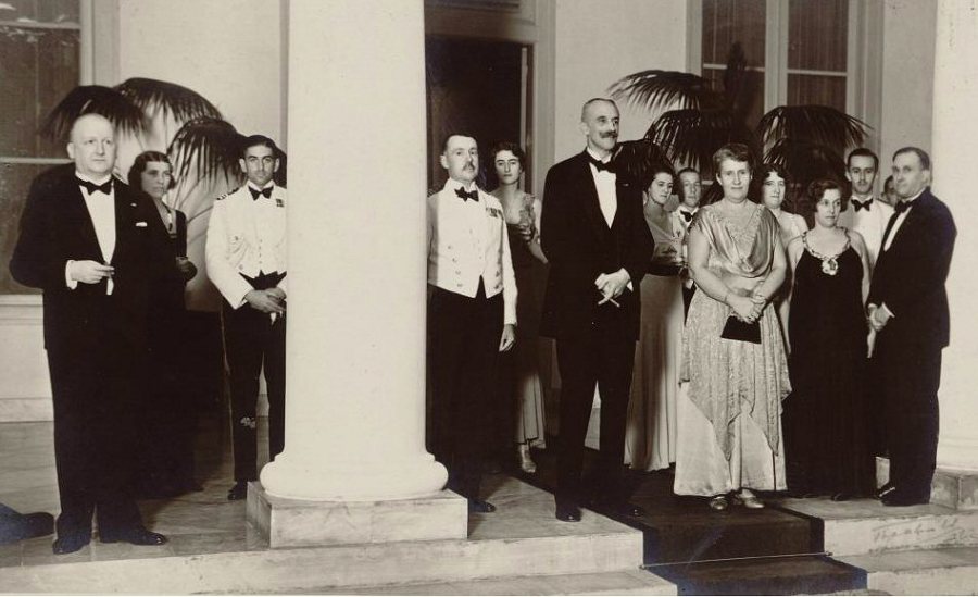 Jhr. mr. B.C. de Jonge en echtgenote Anna Cornelia barones van Wassenaer, op de trappen van het paleis, ca. 1932.