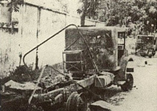 Tevens is op de foto een andere uitgebrande truck te zien. Klaarblijkelijk zijn de trucks na de overval verplaatst want op de grond zie ik geen verbrande resten van de banden van de truck.