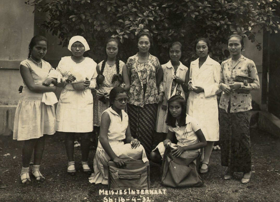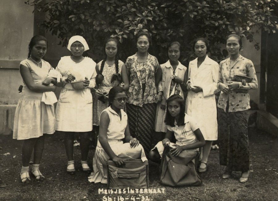 De directrice, mevrouw Mangoenkoesoemo, met de acht meisjes van het internaat. April 1932.