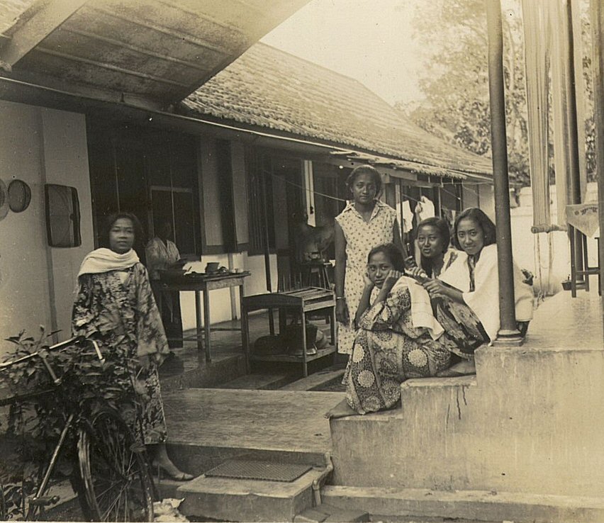 Vermoedelijk achterzijde van het pand Kembodjastraat. Op de achtergrond de bedienden.