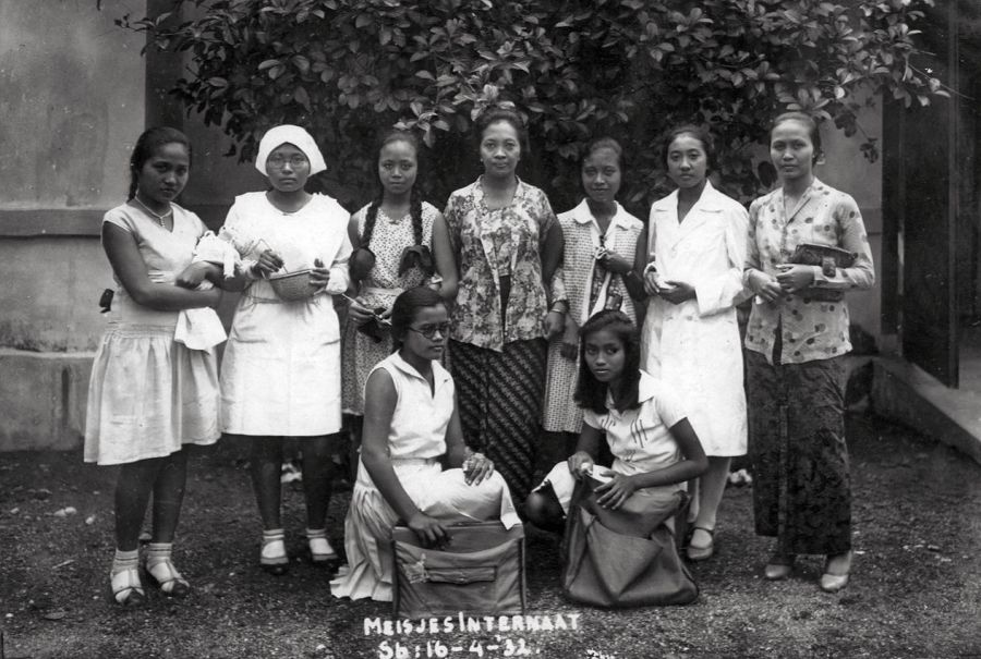 De directrice, mevrouw Mangoenkoesoemo, met de acht meisjes van het internaat. April 1932.