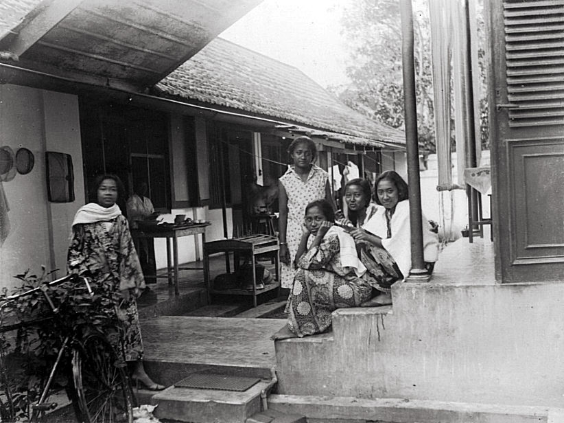 Vermoedelijk achterzijde van het pand Kembodjastraat. Op de achtergrond de bedienden.