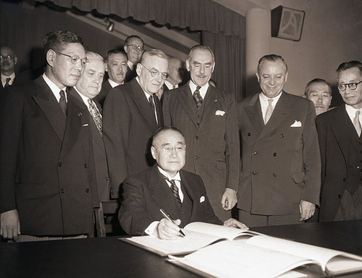 Premier Yoshida ondertekent vredesverdrag, San Francisco, 1951.