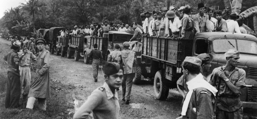 NLD-480218-INDONESIE: Met vrachtwagens woden gevangen soldaten van de Tentara Nasional Indonesia (TNI), geevacueerd. TNI werd gevormd door het samengaan van het Republikeinse leger en de Pemoeda’s per 3 juni 1947. Op Java beschikte ze over 110.000 en op Sumatra over 64.000 man.