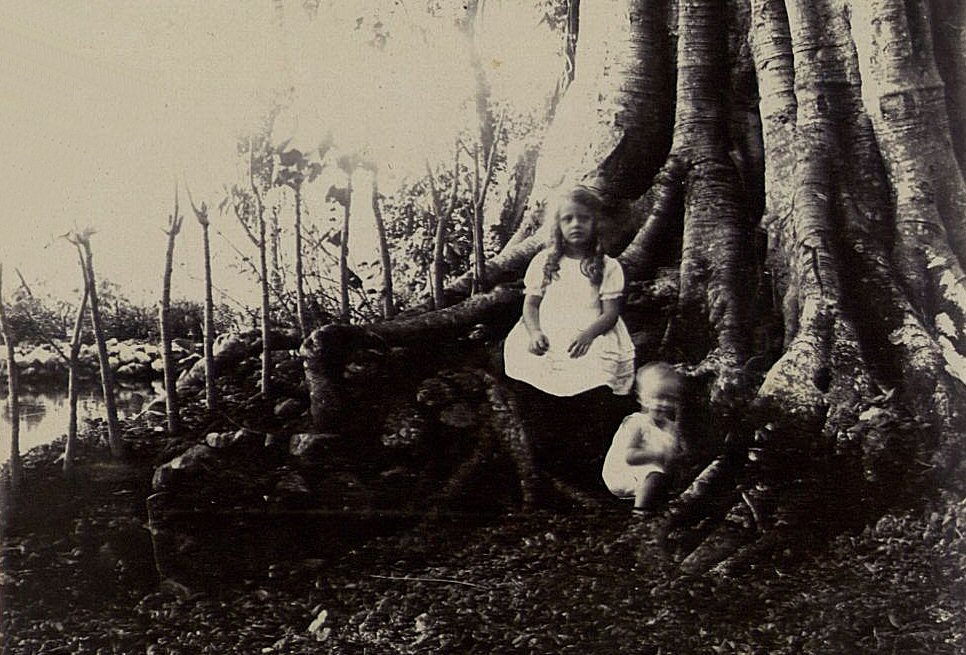 Ons onbekend meisje, samen met Jeanette Feenstra, bij boom, badplaats Pikattan, september 1917.