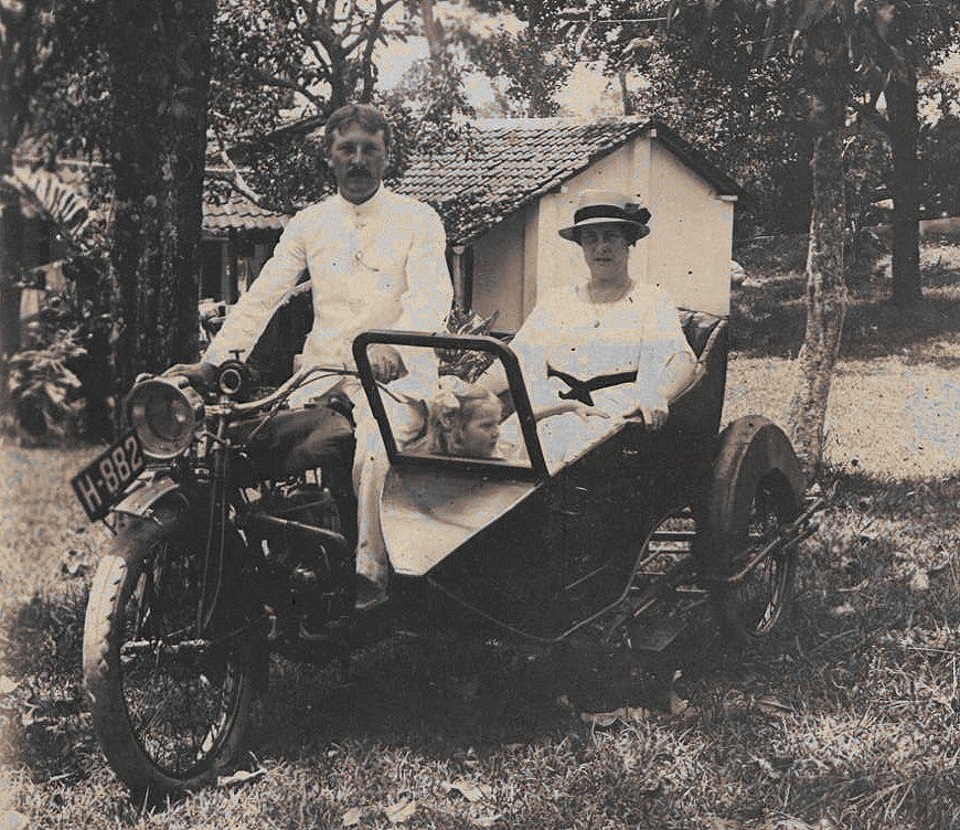 Jeanette Feenstra, met ouders, in motor met zijspan. Djangli, april 1918.