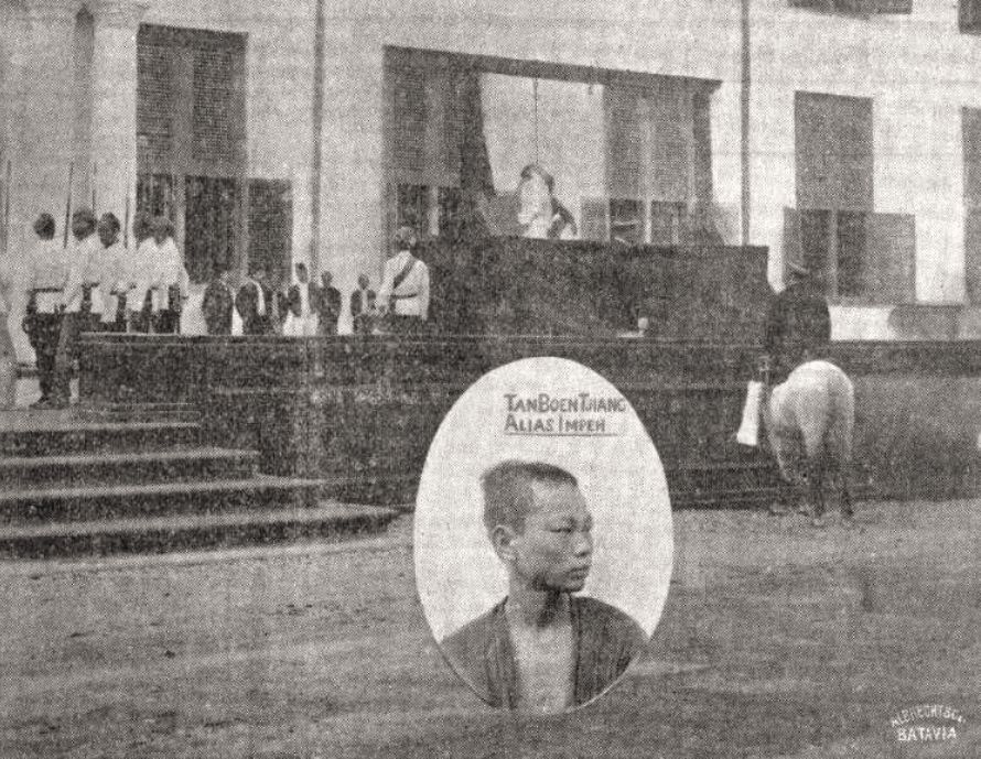 Executie van een doodstraf, door ophanging, voor het gemeentehuis in Batavia, 1896. De gehangene is de Chinees Tan Boeng Tjian, alias Impeh, veroordeeld voor de moord op de Chinese vrouw Njonja Assam.