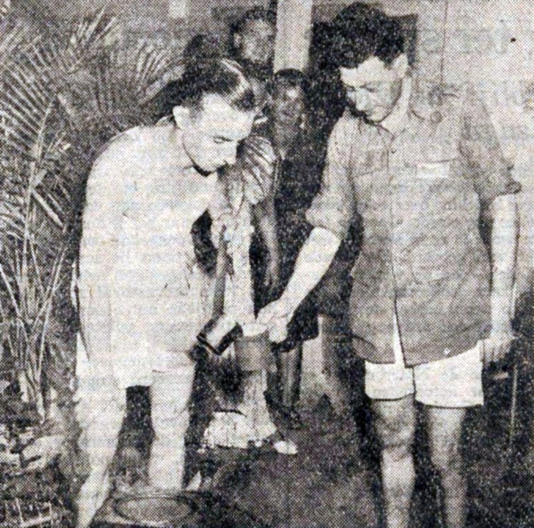 Onderschrift bij de foto van de reünie in 1948: HOT SWEET COFFEE “’t Is hot en het is sweet, maar koffie is het niet” dichtte de kampdichter op de koffie van de hospik, die beroemd werd door zijn brouwsel, dat steeds gereed was om de dorstigen te laven. Kampgenoot De Regt lust nog wel een bakje.