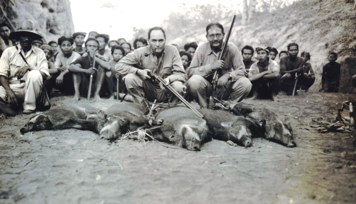 E.G.A. Lapré (links), controleur van West-Lombok, en opzichter Verkeer en Waterstaat W. Hartmann met vijf geschoten evers te Pangoengan, 1940