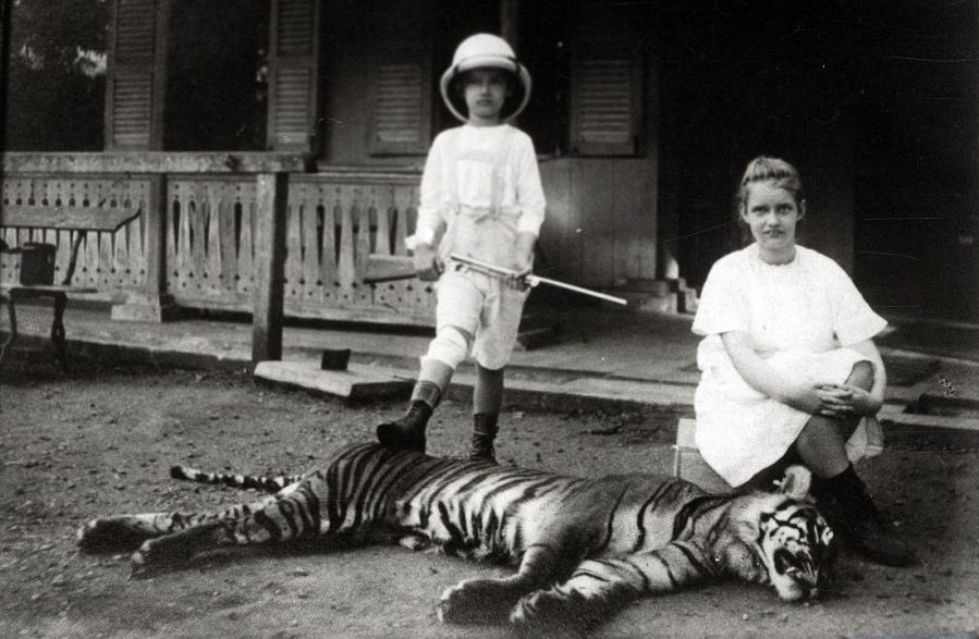 Twee kinderen van de administrateur van tabaksonderneming Gedong Jehore in Deli met een dode tijger, ca. 1914