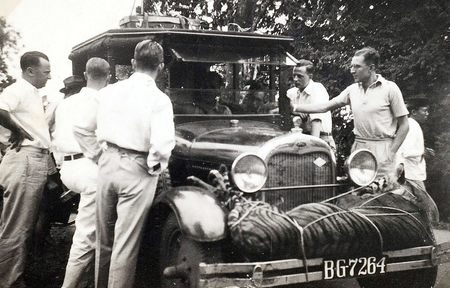 Een gedode tijger vastgebonden op een auto, tijdens een tijgerjacht van J. Heil, werkzaam bij de Bataafse Petroleum Maatschappij, in de omgeving van Palembang, 1933