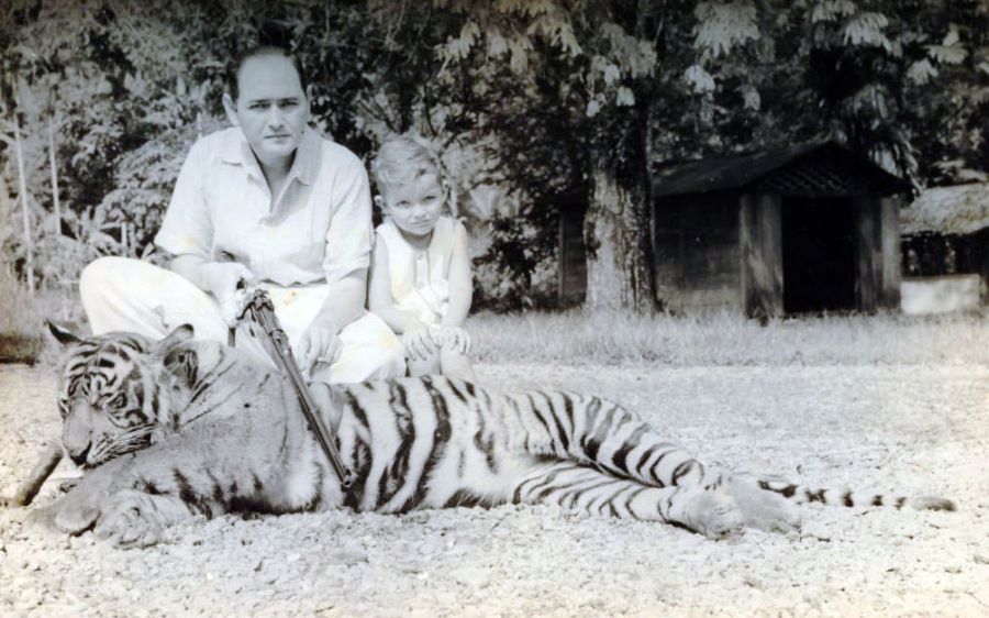 E.G.A. Lapré en zijn zoontej Freddy bij geschoten tijger