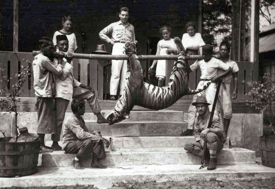 Jachtgezelschap van resident L.C. Westenenk met een geschoten tijger op de Konak, het buitenverblijf van Westenenk bij Kepahian