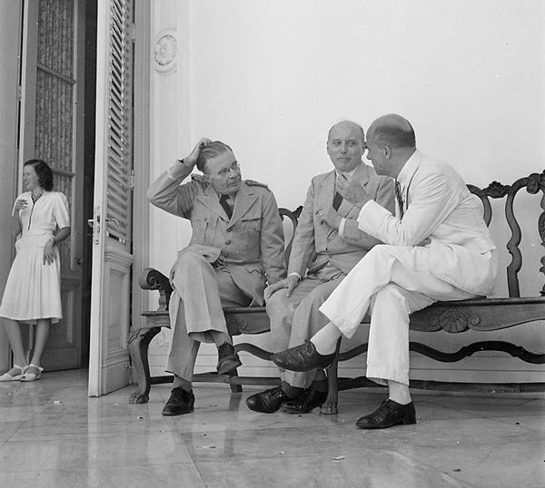 Lt. GG Van Mook en prof. Schermerhorn in de wandelgangen, Weltevreden 1947. (foto Cas Oorthuys)