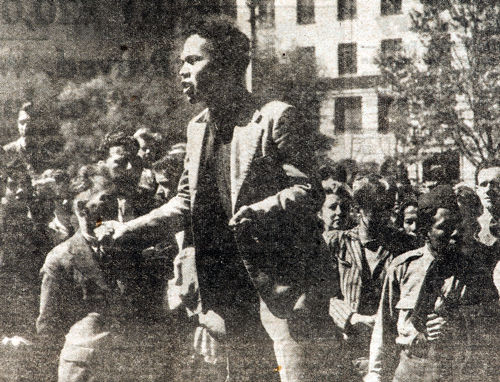 Foto uit de Daily Telegraph van Indonesische zeelieden die toespraken hielden tijdens de pro-Indonesische betogingen, 28 september, 1945