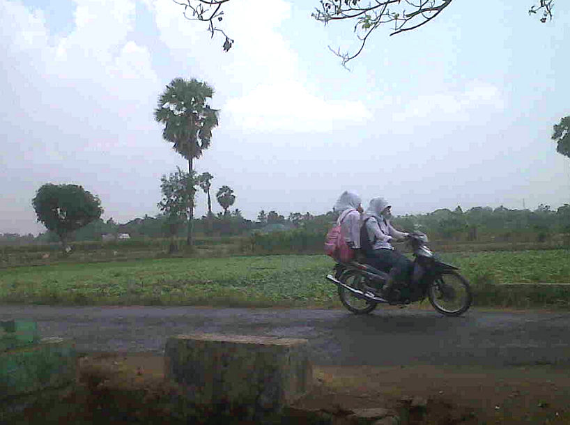 Vrouwen op een brommer in de desa Manjalling, Celebes&Sulawesi