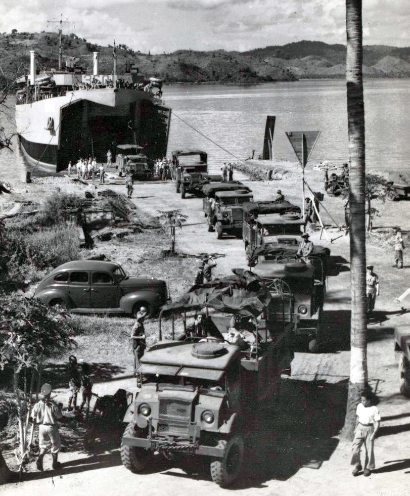 Het zware materieel verlaat de L.S.T. om haar tocht naar Lombok te beginnen (bezetting Lombok Maart 1946)