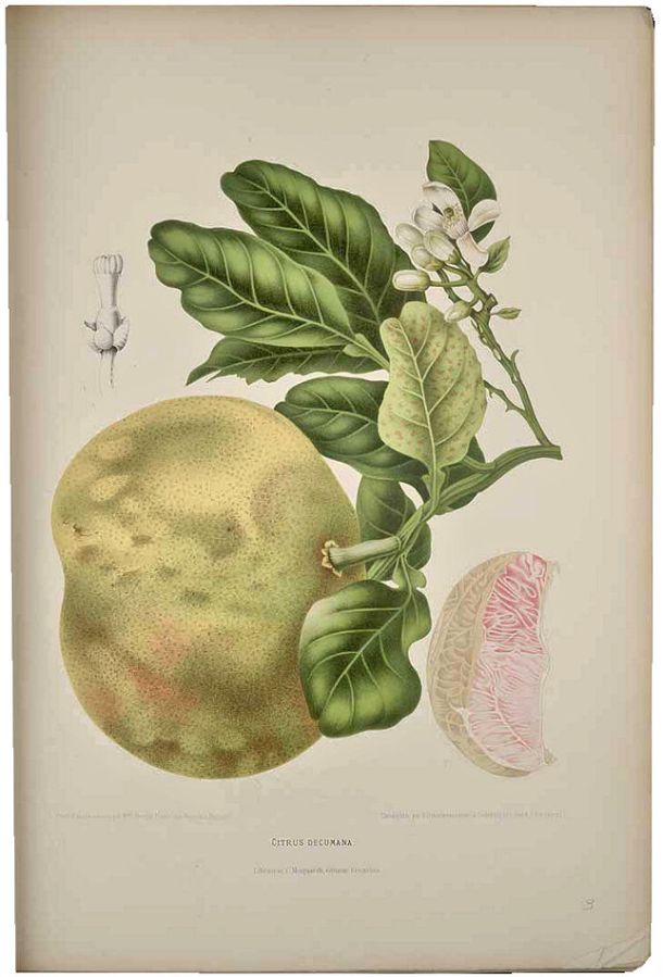 Madame Berthe Hoola van Nooten: ‘Citrus Decumana’ [= Citrus maxima?], lithografie De Pannemaeker, plaat [3] uit: Fleurs, Fruits et Feuillages Choisis de L’Île de Java peints d’après de nature. Bruxelles: Muquardt [1881; derde editie].