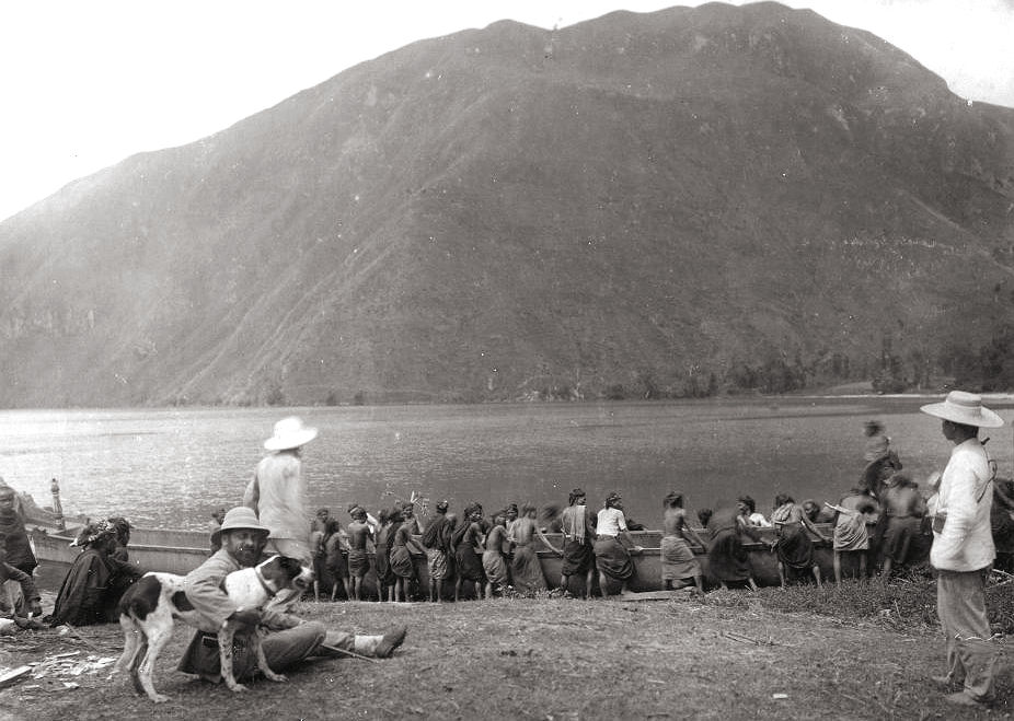 Inheemsen trekken een boot op het droge langs het Toba-meer (kitlv)
