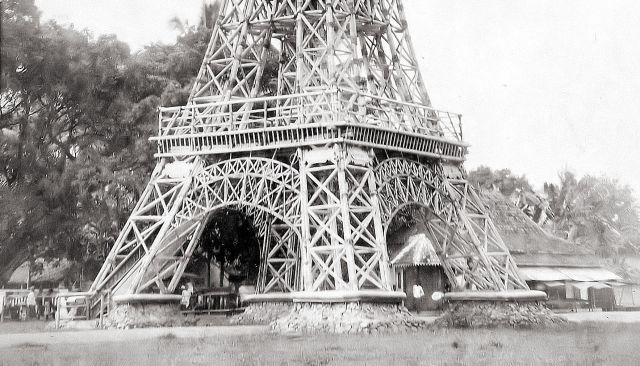 De voet van de bamboe Eiffeltoren in Tasikmalaja, 1898
