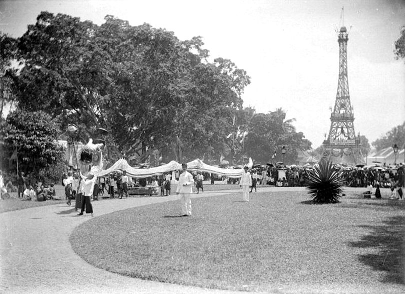 De kroningsfeesten te Tasikmalaja. Op de achtergrond de replica van de Eiffeltoren.