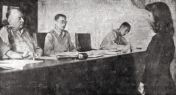 Wilhelmina van Kooten beantwoordt de vragen haar door de rechters gesteld. Achter de rechterlijke tafel van links naar rechts de president van de Temporaire Krijgsraad lt. kol. mr. H. C. C. Staring, kapt. mr. G. A. W. Reyger en de secretaris adj. o.o. P. C. Krijgsman. (De Locomotief, 22 juli 1948)