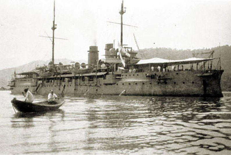 Het pantserschip Hr.Ms. De Zeven Provinciën (1910-1933) tijdens haar tweede reis naar Nederlands Oost-Indië, liggend voor Salumpaga, 1921: een teken van macht.