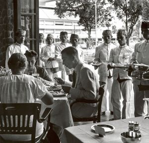 Toen deze foto gemaakt werd, waarschijnlijk in de jaren ´30, zal hij nauwelijks de aandacht hebben getrokken. Een alledaags tafereel van een gezelschap in een restaurant met op de achtergrond een achttal bedienden met verschillende gerechten, mogelijk deel van een rijsttafel. Nu voelen we ons ongemakkelijk bij het zien van deze afbeelding. Waarom? Natuurlijk door de rasongelijkheid. De klanten zijn blank, de bedienden inheems. Kolonialisme pur sang, gevangen in een beeld.