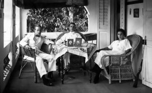 Nog een andere typisch koloniale prent. Een jong stel (hij links, zij rechts) met nog een andere man (een broer?) op de foto voor de familie in Nederland. Zoals bij veel van dit soort foto´s werden de portretten van de achterblijvers in het midden van de foto geplaatst, hetgeen wilde zeggen: we denken aan jullie. Het geweer rechts op de afbeelding geeft aan dat alles onder controle is. “We maken het goed en we zijn veilig”, was de boodschap. Net als in een 17e eeuws schilderij zijn het de details die tellen.