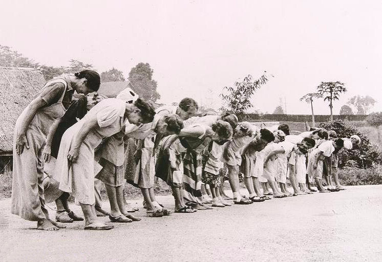 Europese vrouwen in een vrouwenkamp te Singapore buigen voor de Japanners bij het appèl, ca. 1945. KITLV
