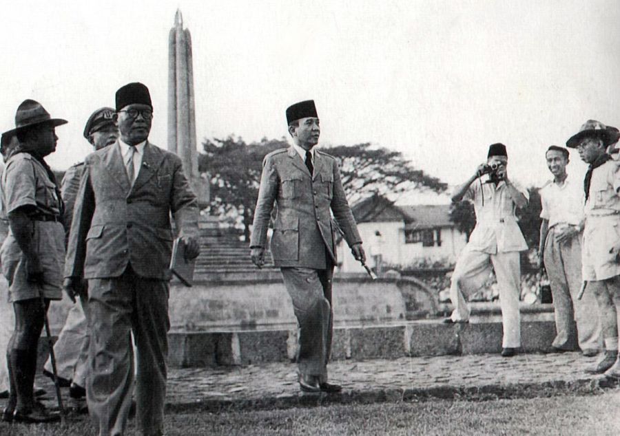 De onthulling van het herstelde monument, mei 1953. Links de burgemeester van Malang, in het midden Soekarno.