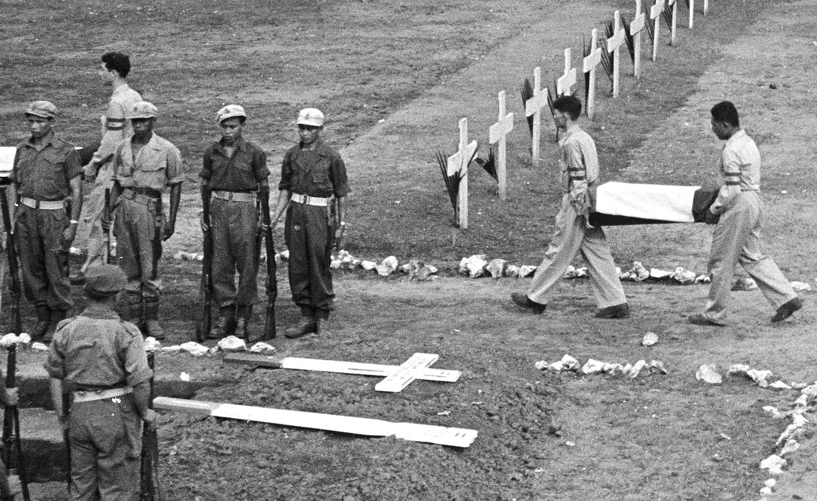 Batavia, Antjol: herbegrafenis geëxecuteerde verzetsstrijders M. Schilling en Hadji Mochtar, 8 maart 1947