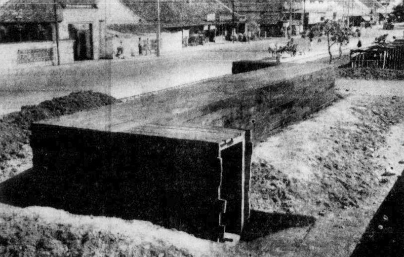 “Een publieke schuilplaats op Molenvliet in de benedenstad, die juist is afgetimmerd en nog met zand en zandzakken moet worden bedekt en zoals In de gehele stad zullen worden gebouwd. “