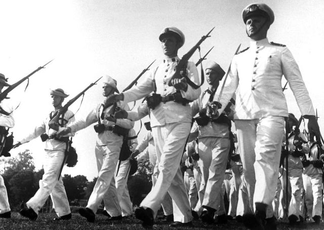 Marcherende mariniers van de Koninklijke Marine in Nederlands-Indië, begin jaren 40. Bron: Fotocollectie Anefo / Nationaal Archief
