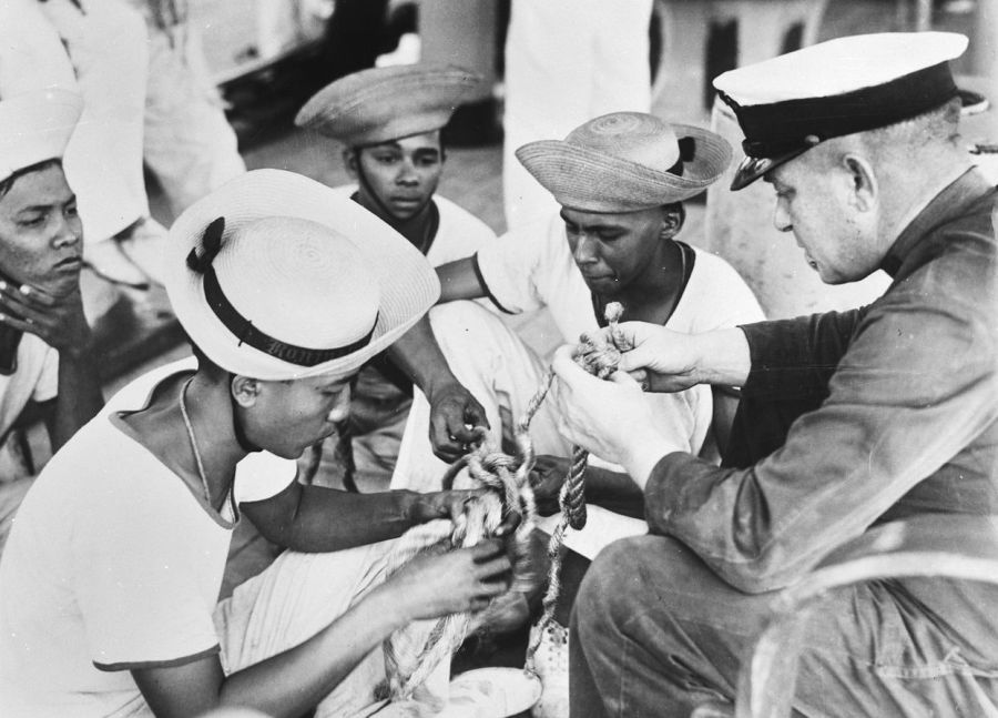 Indonesische recruten van de Koninklijke Marine in Nederlands-Indië leren knopen leggen, periode 1940-1942. Bron: Fotocollectie Anefo / Nationaal Archief