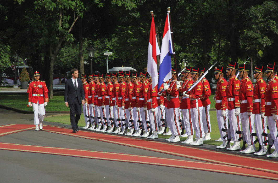 Minister-president Rutte inspecteert de erewacht bij het Indonesiche presidentiële paleis tijdens zijn bezoek aan Indonesië in 2013. Bron: Minister-president Rutte / Flickr