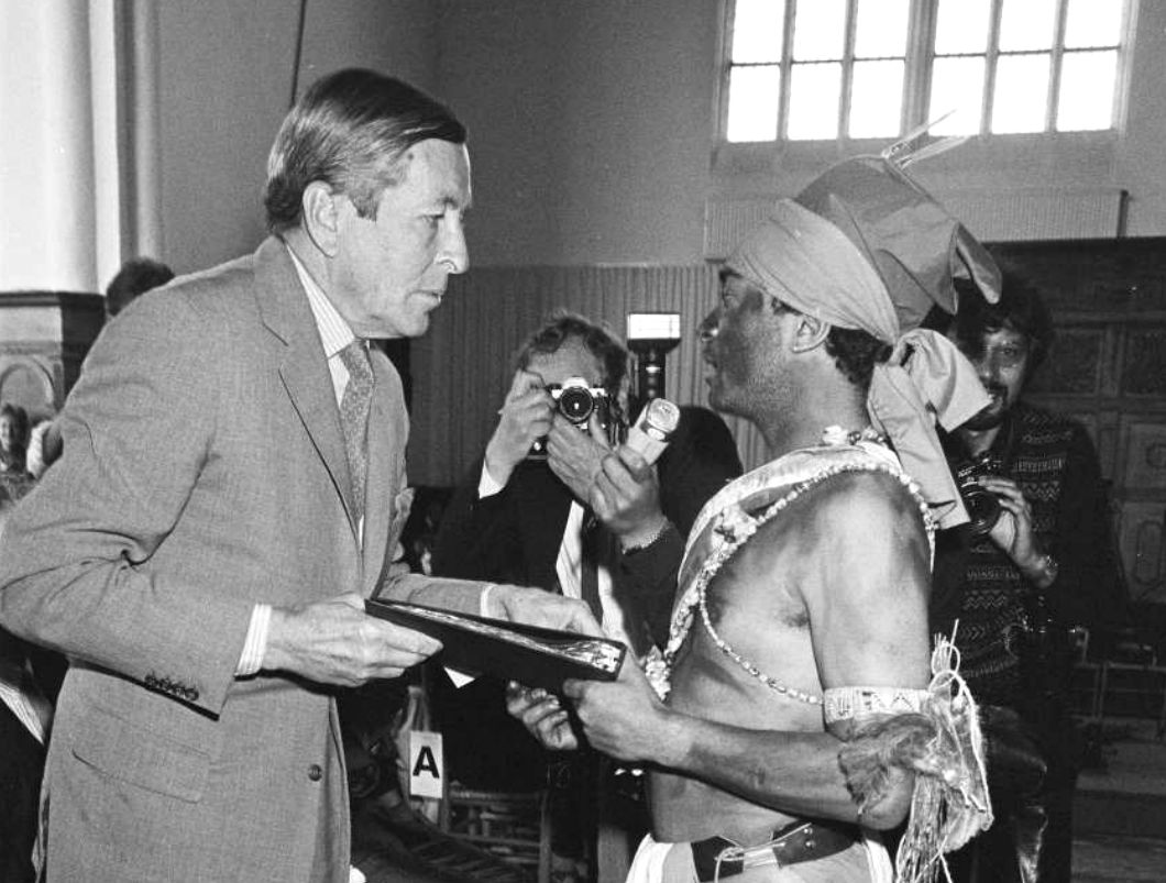 Prins Claus neemt het zwartboek in ontvangst van Willy Nanlohy. Hoorn 19 mei 1987 (Rob C. Croes / Anefo)