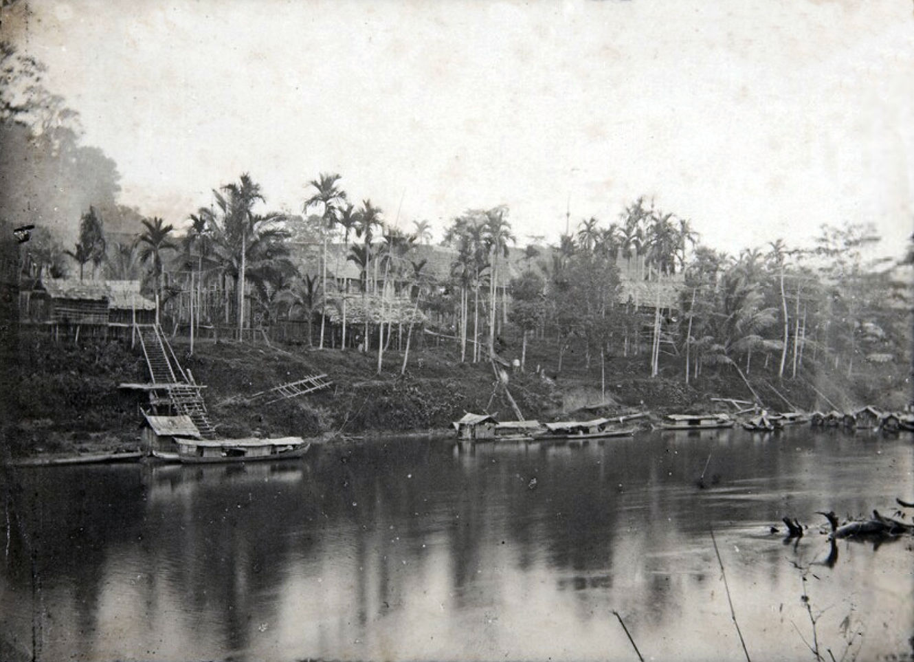 Gezicht vanaf de Kahajan rivier op de Dajak kampong Toembanganoi, Midden-Borneo