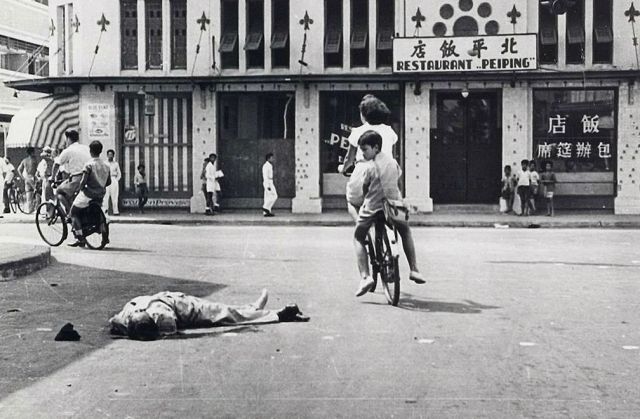 ‘gesneuvelde TNI militair’- Op straat, bij het restaurant Peiping, Bandoeng 23/1- 1950. Ongewapend (!), wandelend, eindelijk merdeka! En dan plotseling uit het niets; neergeknald door een soldaat van een rechtvaardige vorst. Fietsers razen voorbij en een gegontjengde jongen kijkt nog even om. Terwijl overige wandelaars zich naar het restaurant begeven. -Welk verhaal hoort hierbij? Welk emotionele herinnering? Van/over die rechtvaardige vorst of… die jonge gedode TNI’er, wiens merdeka droom hij niet heeft mogen meemaken?