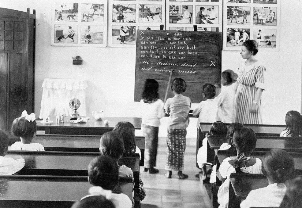 Onderwijzeres Hamer met leerlingen voor het schoolbord tijdens een les Nederlandse taal in de eerste klas van de Kartinischool te Buitenzorg, ca 1920 (TM)